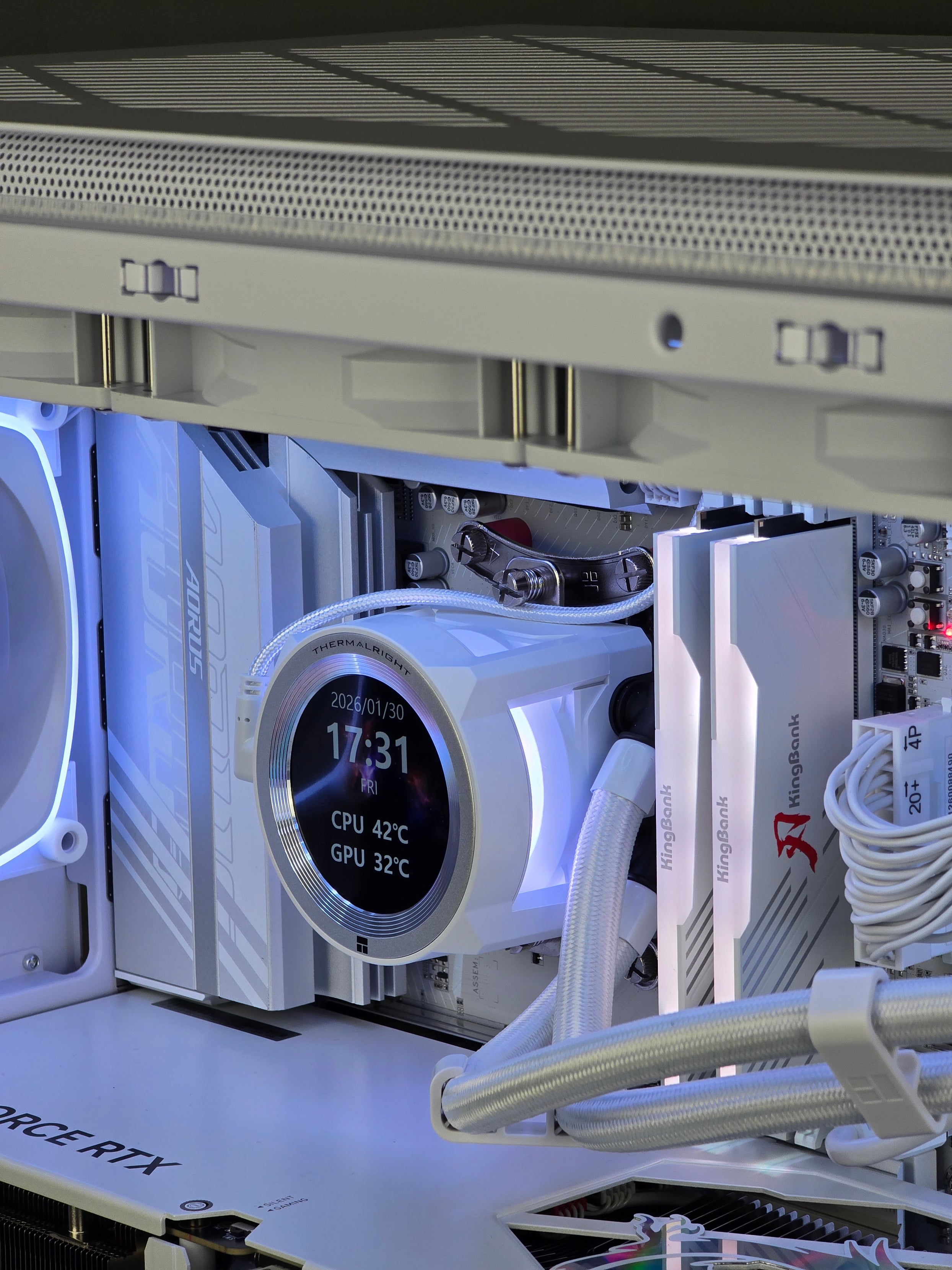With 32GB DDR5 high-speed memory and a 2TB PCIe Gen 5 NVMe SSD, SNOW White 2.0 ensures lightning-fast load times and seamless multitasking. Cooling is handled by a 360mm RGB AIO liquid cooler with an LCD display, keeping temperatures low and acoustics quiet while maintaining the system’s refined look.